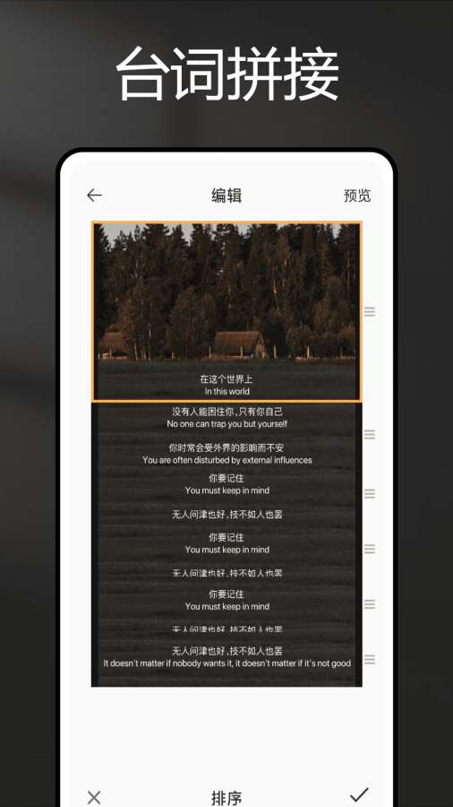 - 台词拼接,一键导入多张图片,即可开始自由编辑台词模板,尺寸调节灵活自由,快来输出你的文艺范儿