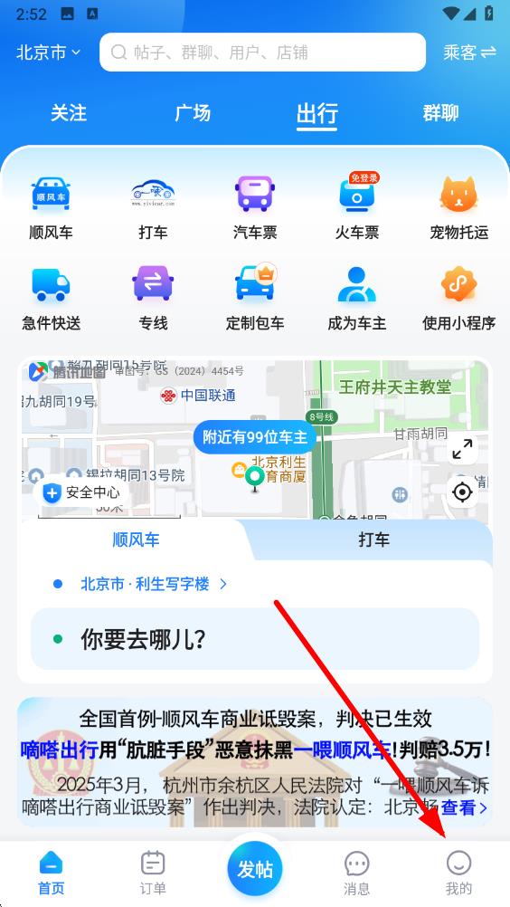 1、打开一喂顺风车app,进入主界面,点击底部导航栏最右侧我的图标,进入个人相关界面。