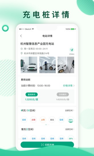 1、附近发现,实时定位自己位置即可自动发现附近的全部充电桩。