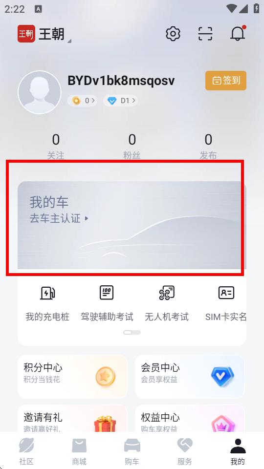 2、在我的页面中,找到我的车区域,点击去车主认证。