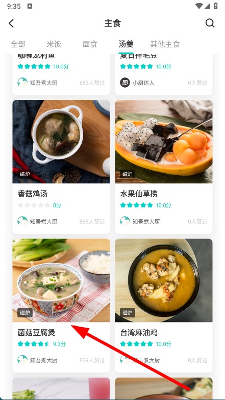 3、在汤羹类主食列表中,选择菌菇豆腐煲。