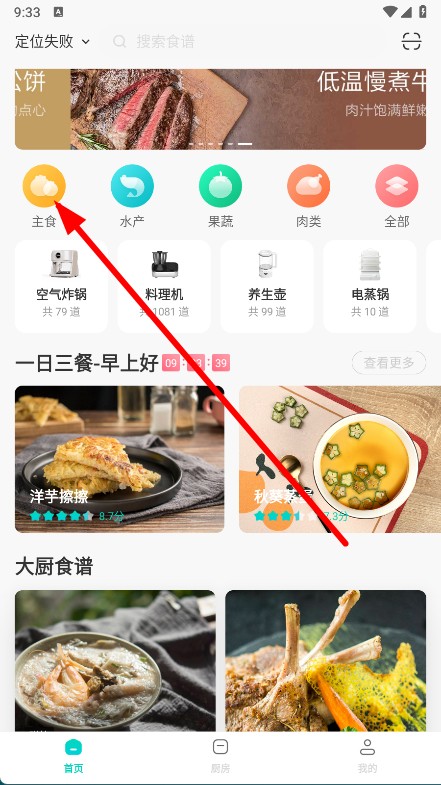 1、打开知吾煮APP,在首页点击主食分类。