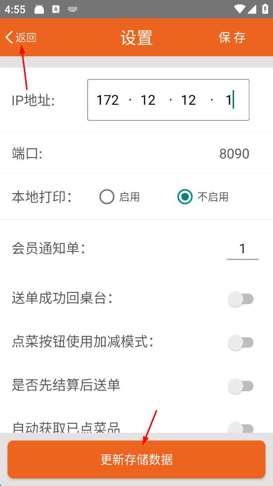 3、IP地址输入完成后,点击“更新存储数据”,然后点击左上角“返回”,回到登录界面。