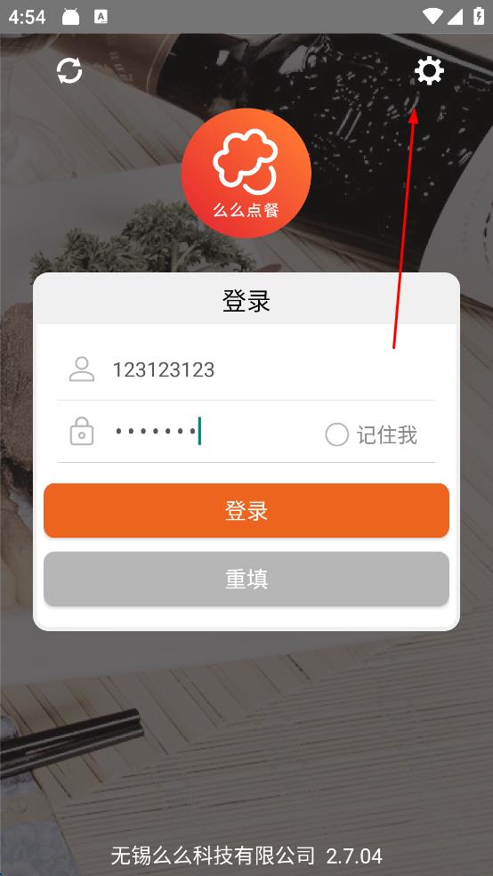 1、打开么么点餐App,进入登录界面,输入账号和密码,此时先点击界面右上角的设置图标,进入设置页面。