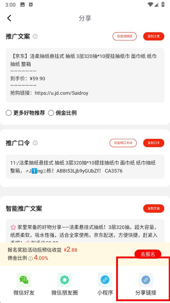 3、在商品详情页面,点击分享按钮,选择分享链接等分享方式,将商品推广链接分享给他人,当他人通过您分享的链接购买商品后,您即可赚取相应的佣金。