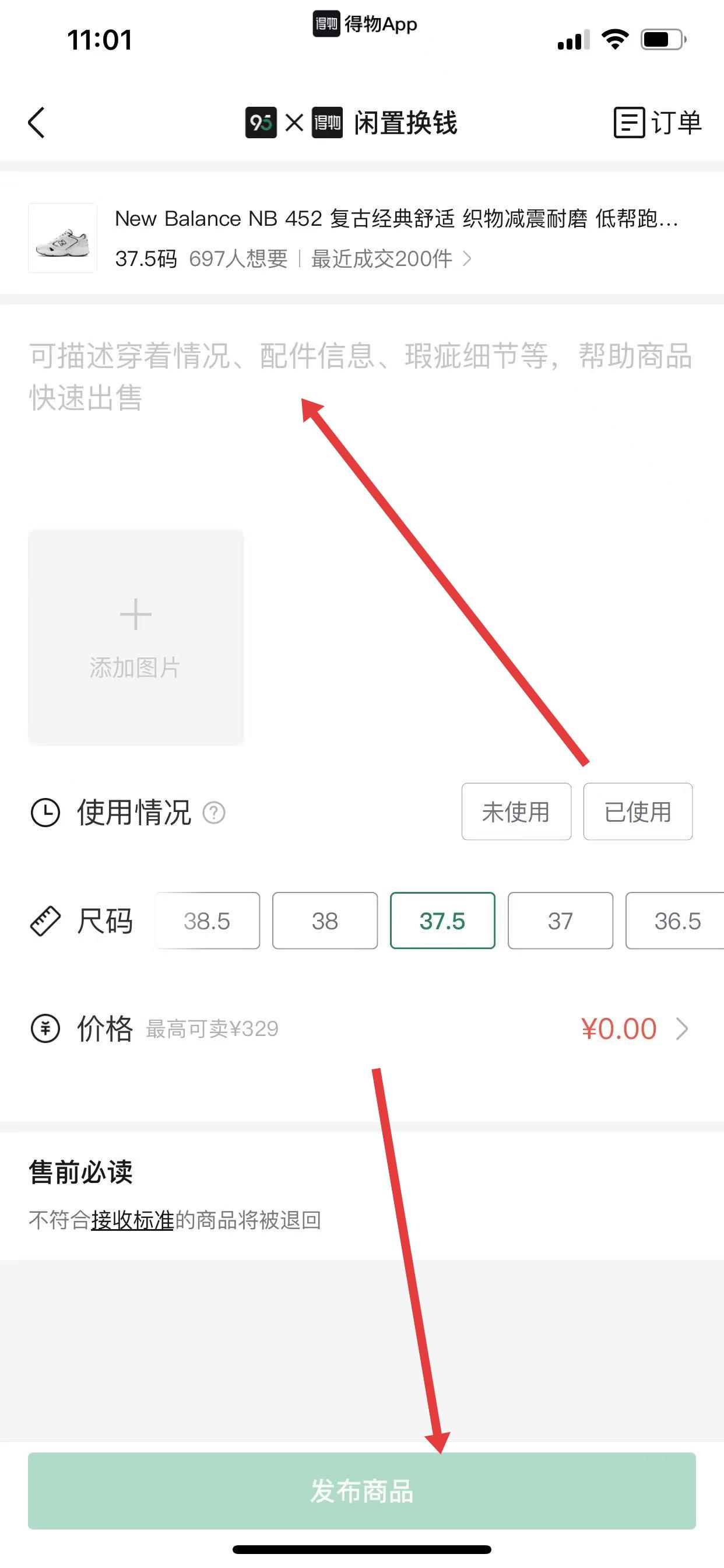 3、进入闲置换钱页面,填写商品穿着情况、配件信息等,添加商品图片,选择使用情况和尺码,设置价格,点击发布商品。