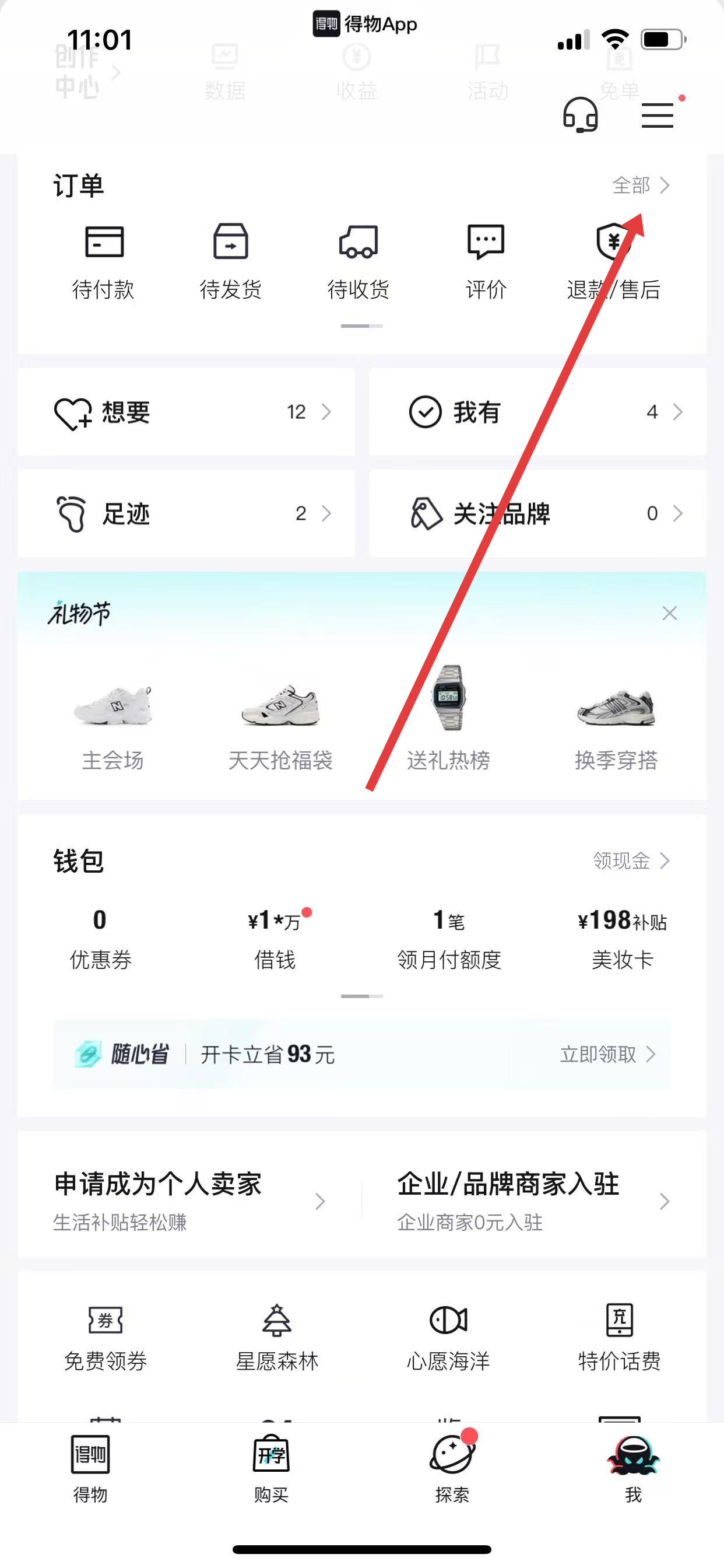 1、打开得物APP,在订单板块点击全部,进入全部订单页面。