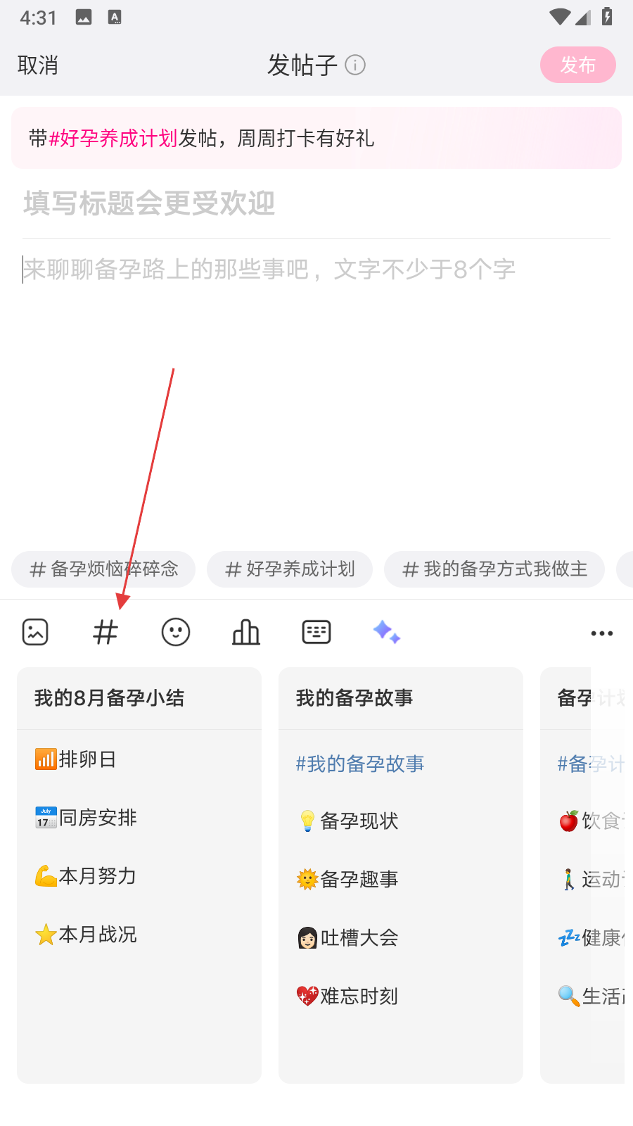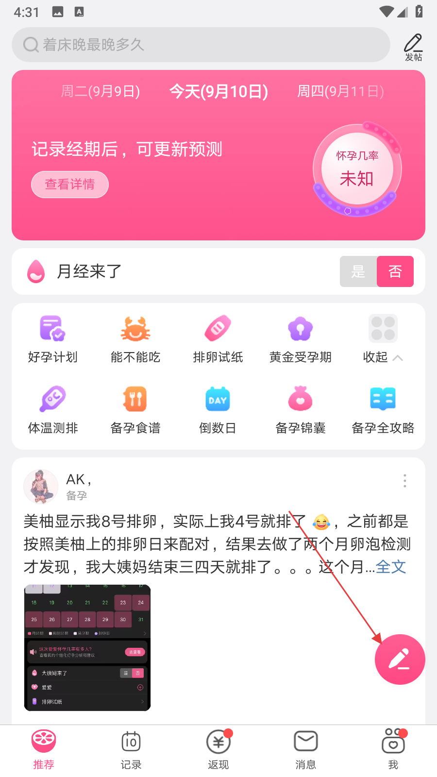 1、打开美柚APP,点击页面右下角的粉色铅笔图标,进入发帖编辑页面。