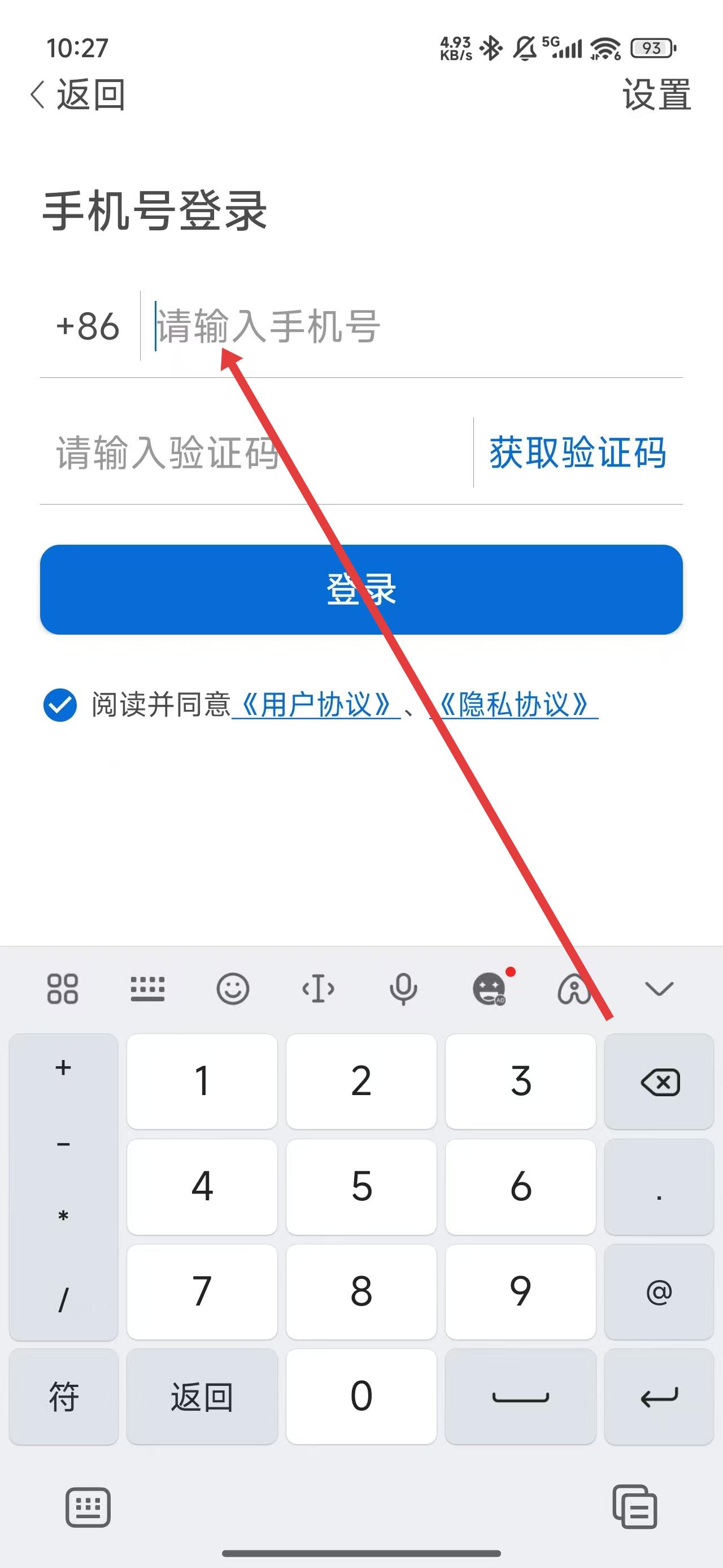 3、跳转到手机号登录界面时,点击输入框填写手机号以便获取验证码。