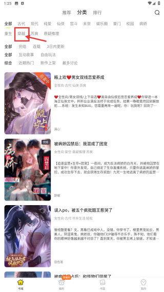 2、在分类页面,点击穿越题材标签,进入穿越类小说列表页。