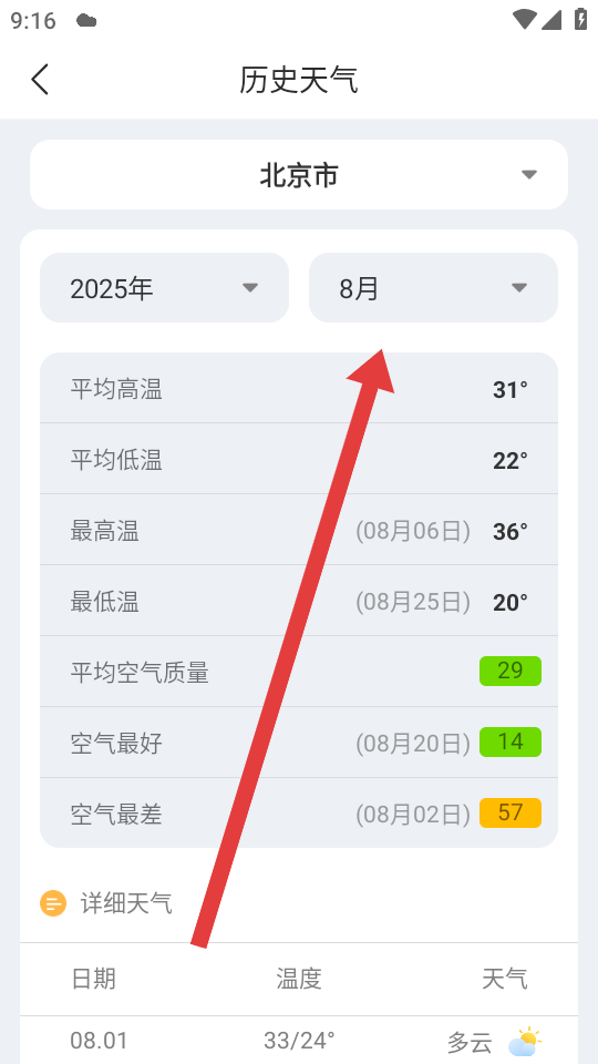 3、我们这边选择7月份历史天气,完成后页面将展示该城市对应7月的平均高温、低温、空气质量等天气数据。