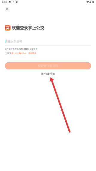 3、在密码登录界面,输入手机号后填写对应密码,勾选协议,点击登录按钮,完成掌上公交账号登录。