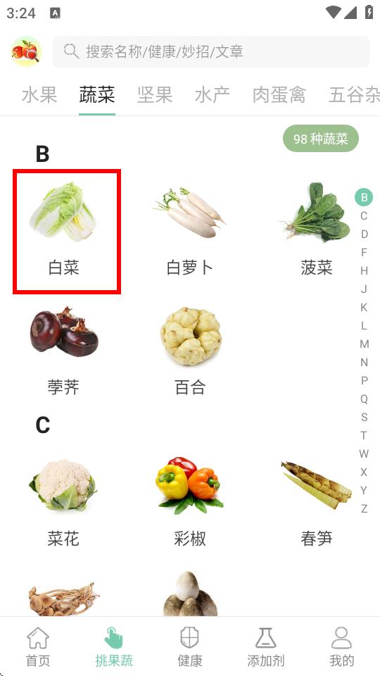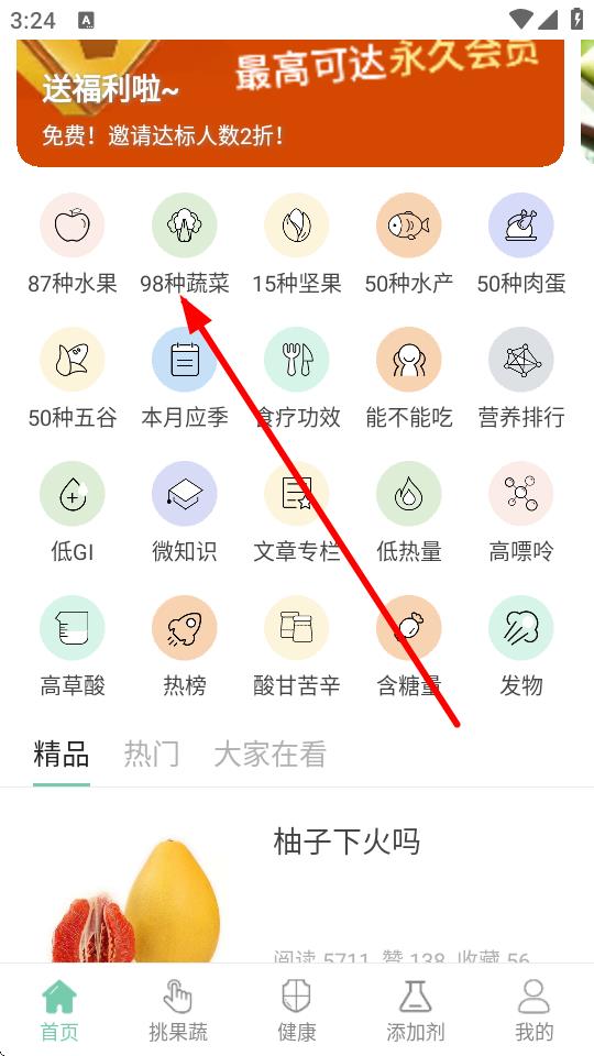 2、在首页中点击98种蔬菜,或者根据要挑选的产品类别,点击87种水果、15种坚果等对应类别。