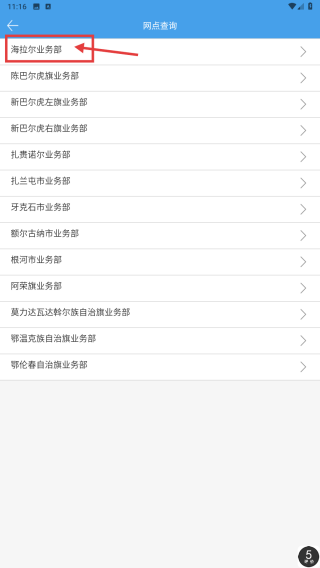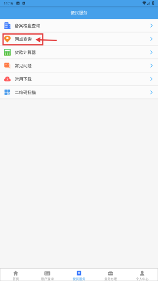 2、在便民服务页面,点击网点查询选项,查看各业务部列表。