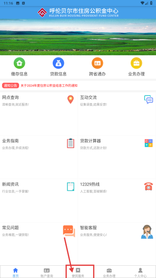 1、打开呼伦贝尔市住房公积金中心APP,点击底部便民服务选项,进入便民服务页面。