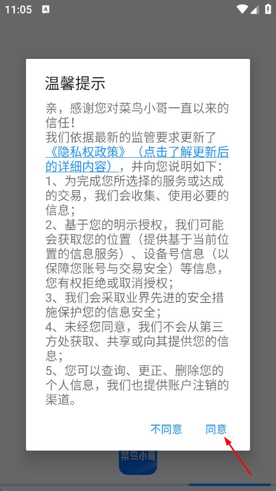 1、打开菜鸟小哥APP,在弹出的温馨提示框中,仔细阅读相关内容后,点击“同意”,进入登录界面。