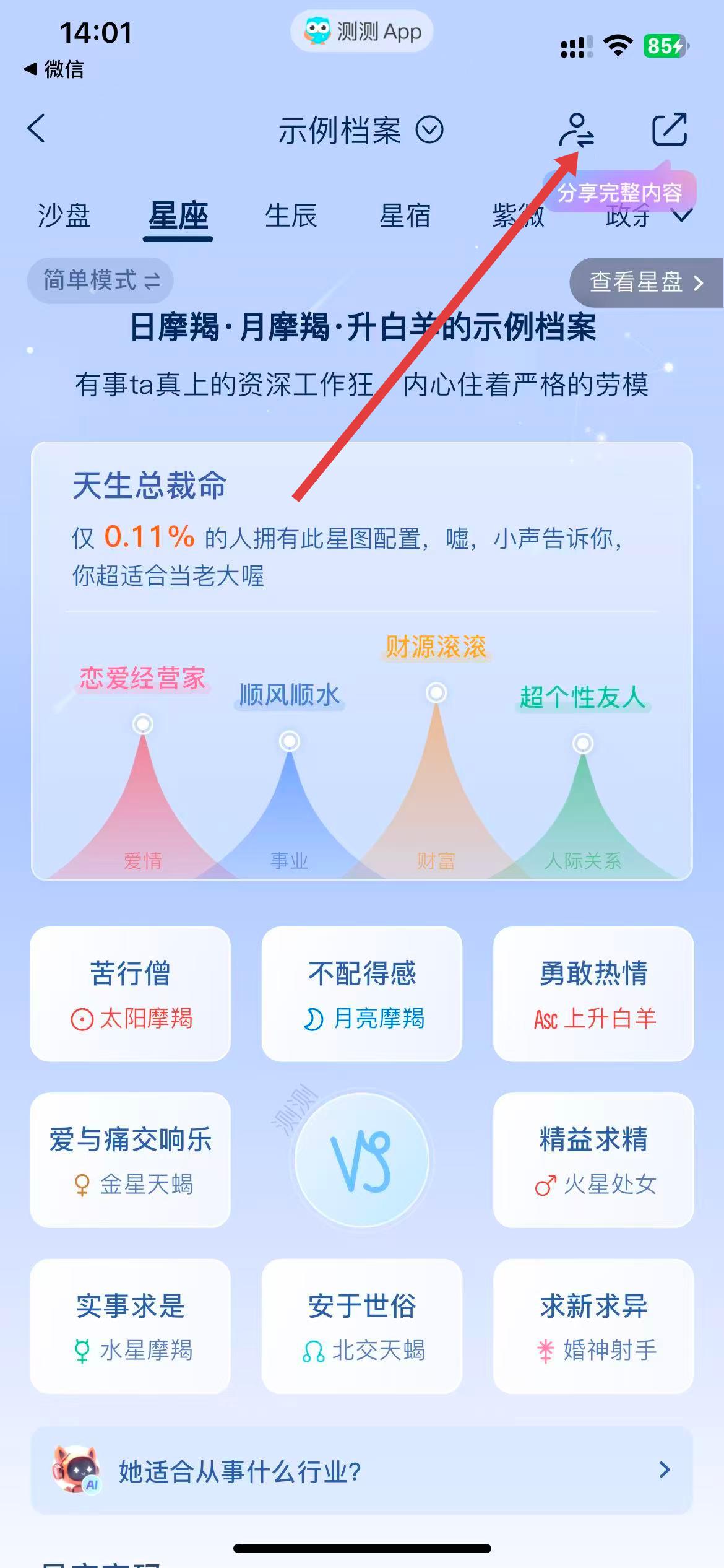 4、进入所选档案的星座分析页面,查看对方的星座分析结果。