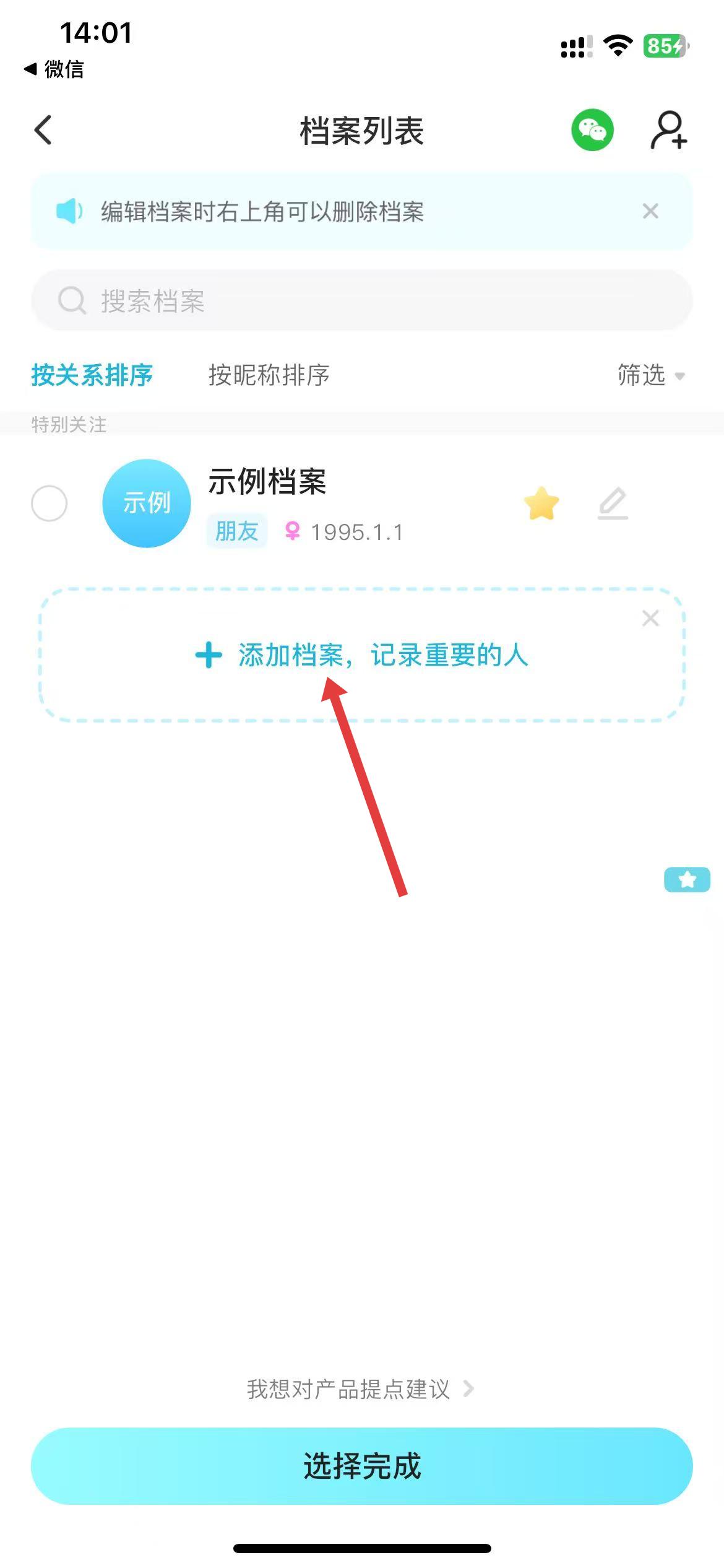 2、在档案列表界面,点击添加档案,填写对方相关信息。