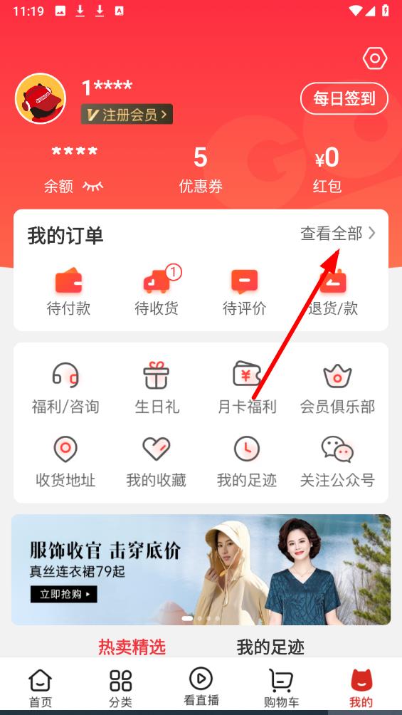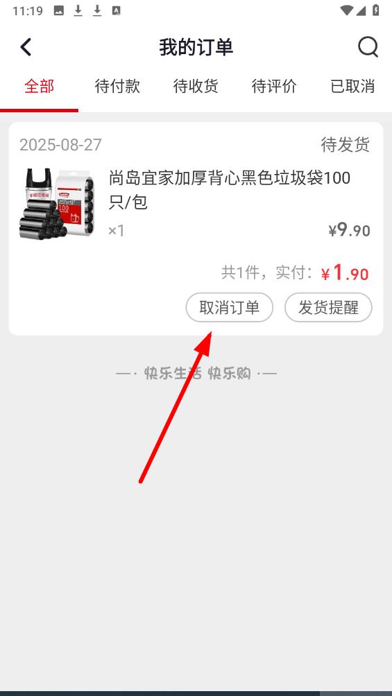 1、打开快乐购物APP,点击底部导航栏中的我的进入个人页面,在我的订单板块点击查看全部进入完整订单列表页面。