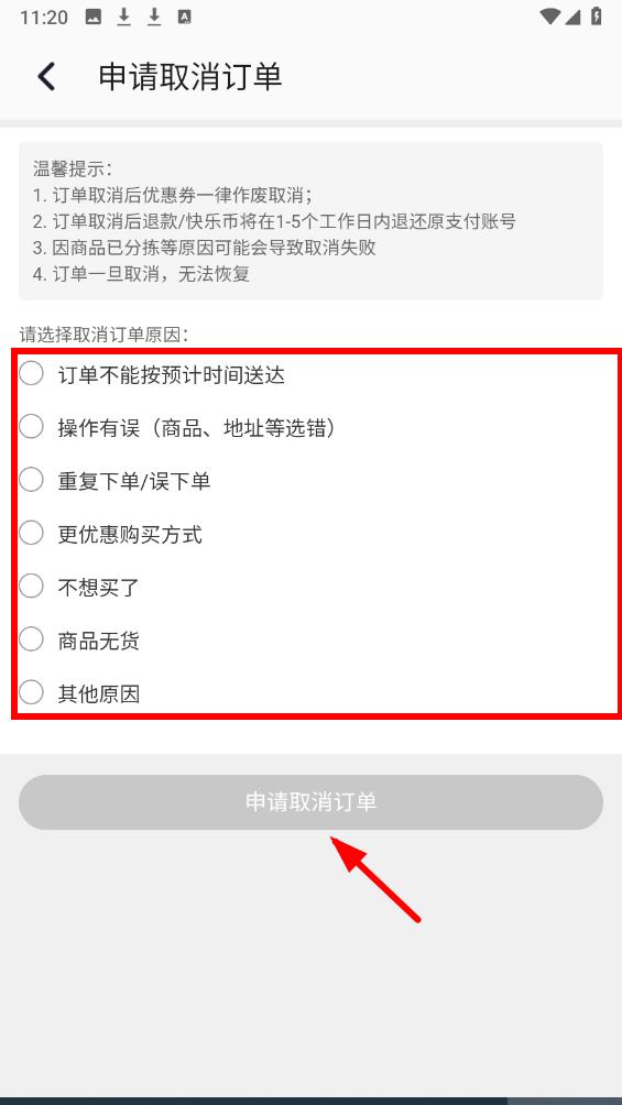 3、进入申请取消订单页面后,然后在下方选择取消订单原因,最后点击申请取消订单按钮,提交取消订单申请。