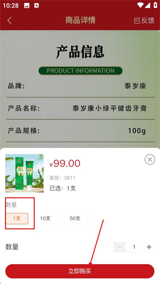 3、在详情页,点击立即购买按钮,进入商品数量选择窗口。