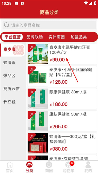 2、在分类页面,点击目标商品如泰岁康小绿平健齿牙膏,进入商品详情页。
