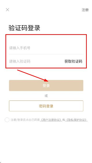 3、在验证码登录页面填写手机号和验证码,勾选相关协议后点击登录完成账号登录操作。
