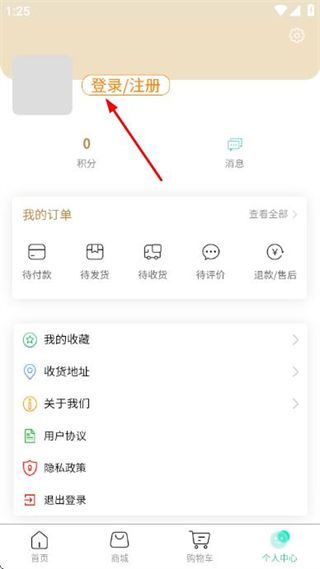 2、在个人中心页面点击登录注册,进入验证码登录页面。