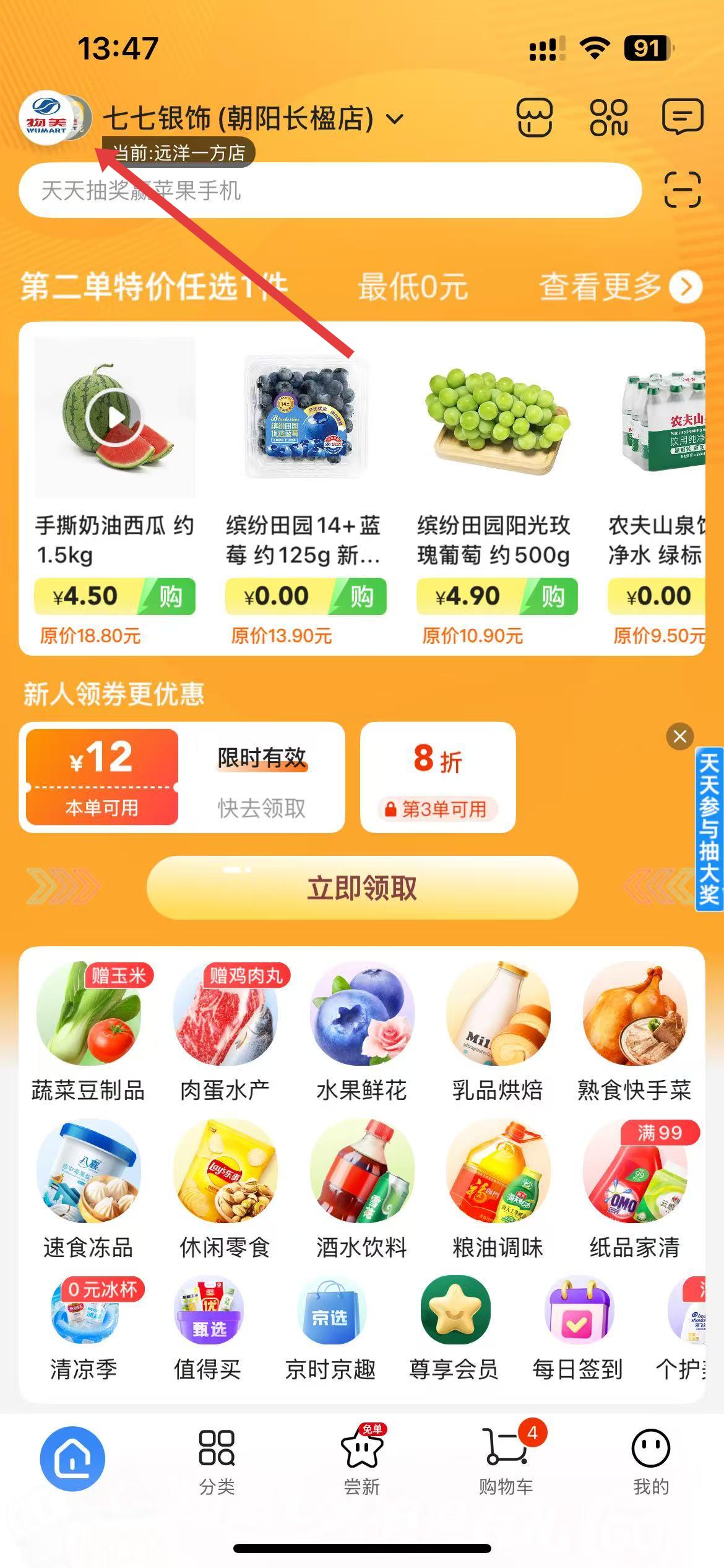 1、打开多点购物app,在首页点击顶部显示当前门店名称的区域,进入城市选择相关页面。