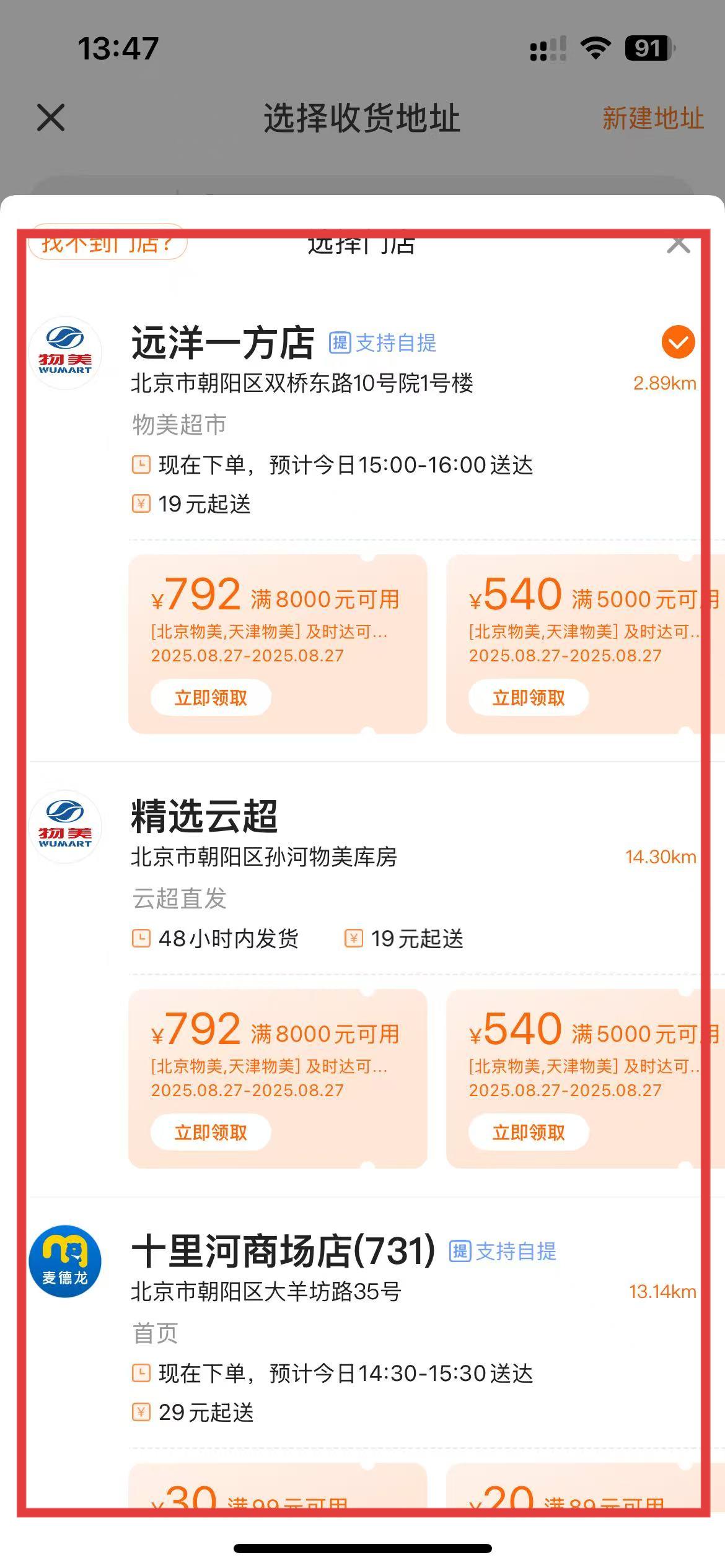 3、定位城市后,系统会展示该城市内的可用门店,在选择收货地址页面中查看各个门店信息,根据自身需求选择合适的门店,点击门店选项即可完成选择。