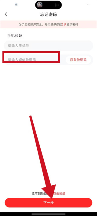 3、将收到的短信验证码填入短信验证码框,点击下一步,进入新密码设置页面。