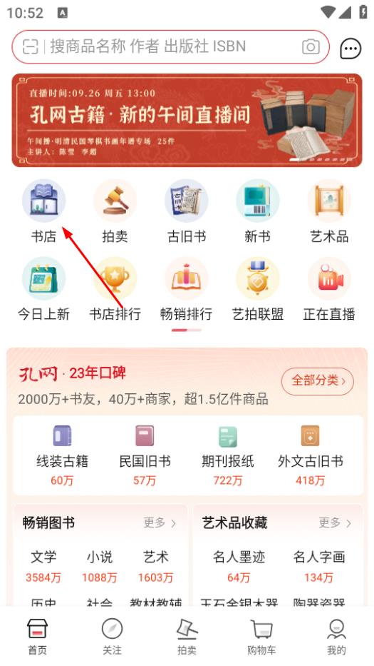 1、打开孔夫子旧书网,点击书店,进入孔网书店页面。