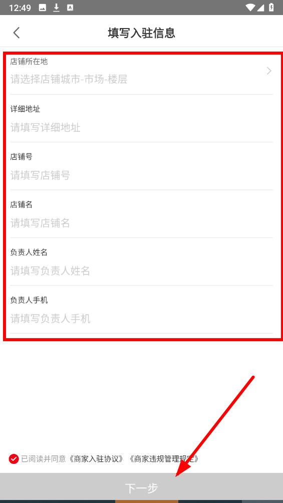3、在填写入驻信息界面,依次如实填写信息,勾选同意相关协议后点击下一步完成后续开店操作。