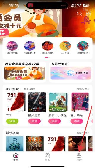 1、启动中国电影app,在首页内点击右下角我的图标。