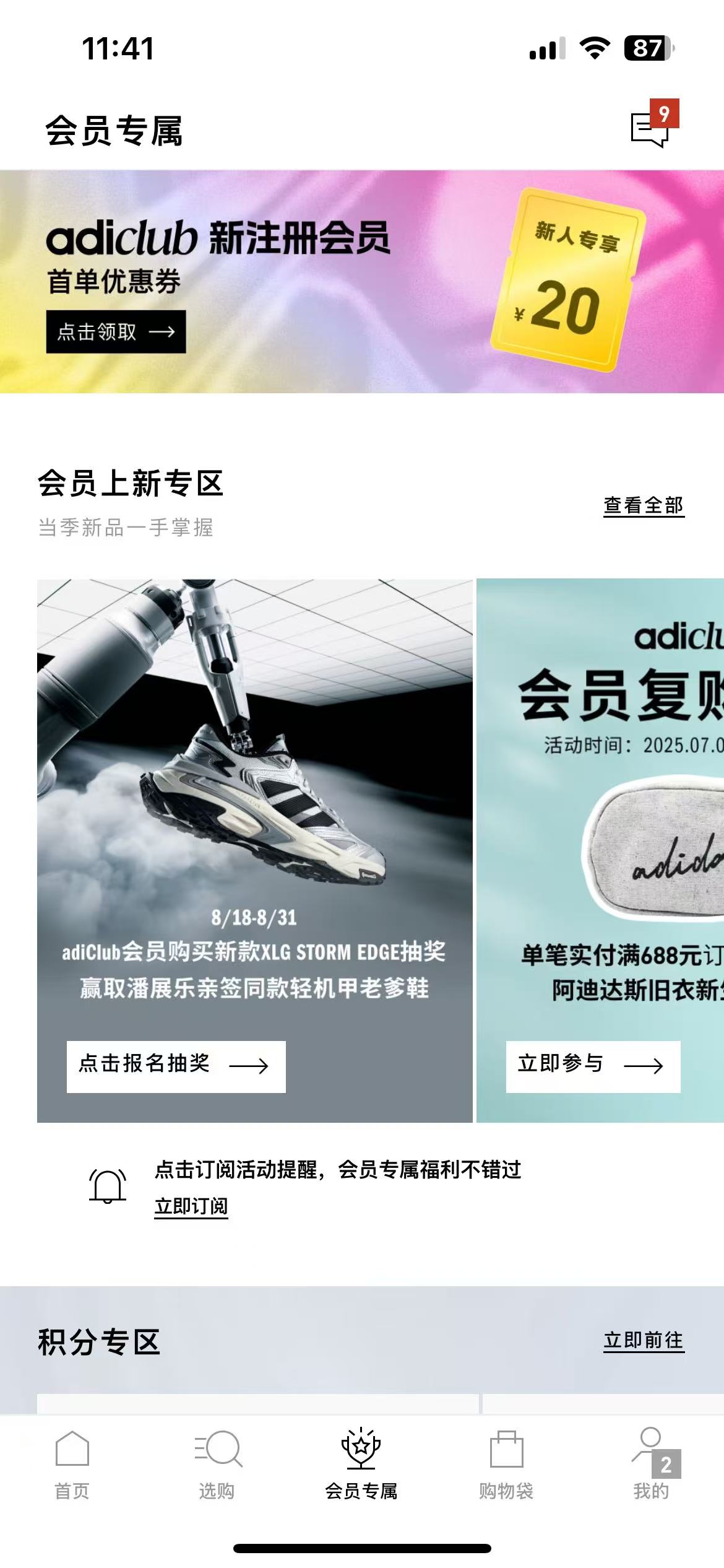 1、打开阿迪达斯app进入首页后,点击底部导航栏最右侧的我的图标进入个人相关界面。