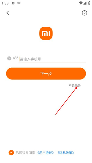 1、在小米账号登录初始页面,点击密码登录选项,切换至密码登录界面。