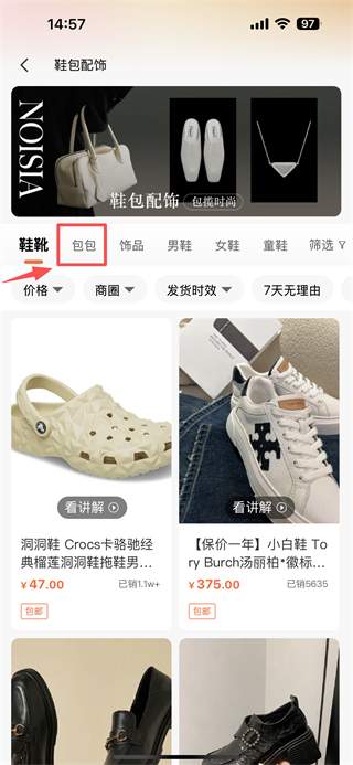2、在鞋包配饰商品专区,点击包包类目,进入包包商品列表页。