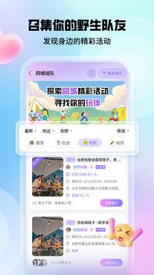 同城组队 - 开启线下报名发布活动,用真实的组队与聚会唤醒人与人之间的温度,与志同道合的人面对面交流感受真实的社交魅力。