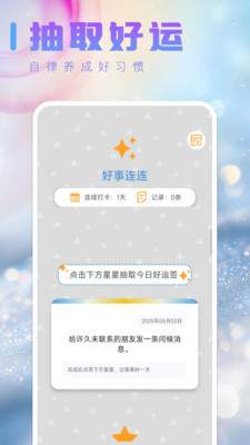 “好事连连” 是一款传递美好与幸运的应用!在好运签板块点击星星抽取专属好运签,完成任务点亮星星,随时回顾过往幸运;记录版可留存每日一件好事,珍藏生活美好;传递链既能收获他人温暖寄语,也能写下祝福传递善意。用它捕捉生活小确幸,让好运与温暖持续蔓延! 来自应用汇: 好事连连