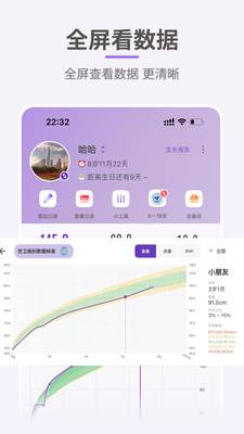 - 生长曲线支持全屏查看、百分位展示、表格模式,直观了解成长趋势。