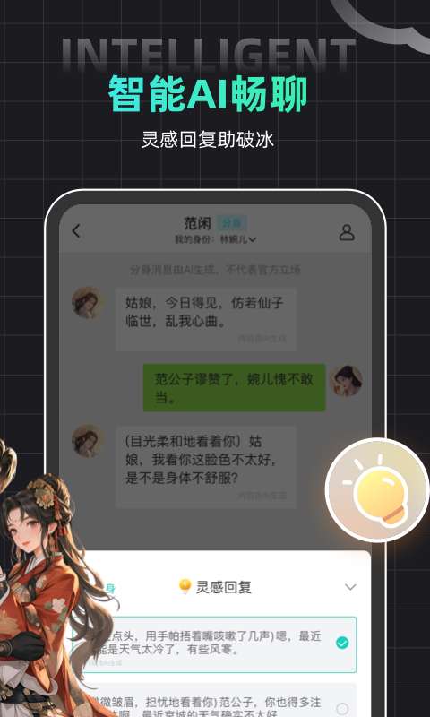 深度智能 AI,模拟角色趣无穷。灵感回复助破冰,聊天创意永不断。