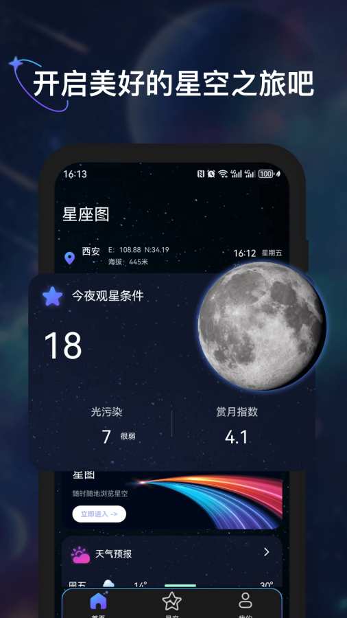 抬眼是银河倾泻的星图长卷,指尖是星座低语的天体诗篇 —— 在这里,让观星不止于仰望,让每颗星辰的故事,都成为你触手可及的宇宙私语!核心功能:观星检测:基于天气预报的信息,实时分析当前天气,给出观星的合适条件,在时机观星哦。实时星图: 基于您的位置和时间,实时显示当前天空中的星座、行星、恒星等天体。星座运势:查看属于自己的星座,查看今天、明天、本周的运势,做到心中有数,有的放矢。 来自应用汇: 天文宝