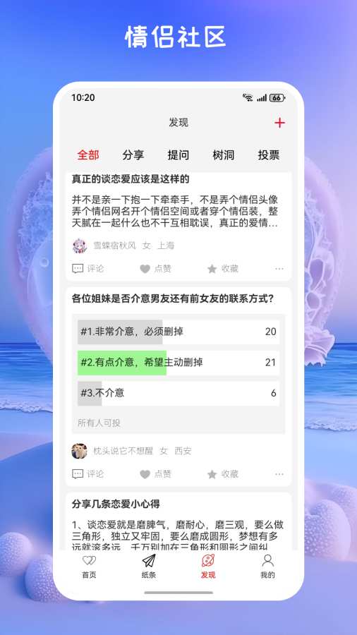 10. 情侣社区: 分享甜蜜日常、提问获取情感建议、倾诉恋爱烦恼、问答投票
