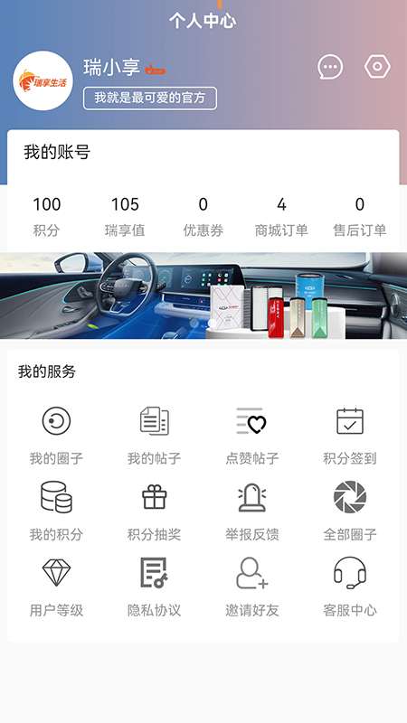 奇瑞瑞享生活APP,融合社交与电商,畅享车生活。【社交互动】分享用车及生活日常,可按车友圈、地域、兴趣加入社群,互动交流更贴心。【瑞享Life】选购汽车周边及生活潮品,轻松查找心仪好物一键购买,满减、折扣优惠不断。一站式车生活社区,连接你我,便捷无忧。 来自应用汇: 奇瑞瑞享生活