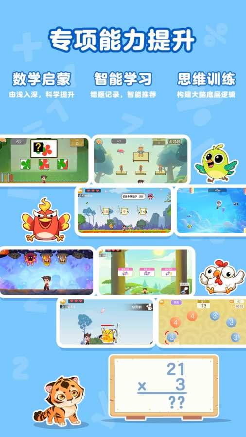 精心设计思维启蒙新模式,通过游戏的方式将严肃的知识点,制作成有趣的玩法,让孩子在玩得开心的基础上锻炼思维,养成勤于思考的好习惯,从此爱上学习,主动学习。