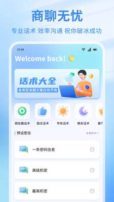 一款超级实用的话术工具,不仅有朋友圈话术,励志话术,早安话术,晚安话术等等,更有加密功能,私密性强,空间管理功能,能够对照片,文件进行管理,还能够设置密码,拼图功能也是让人眼前一亮。 来自应用汇: 米言聊天