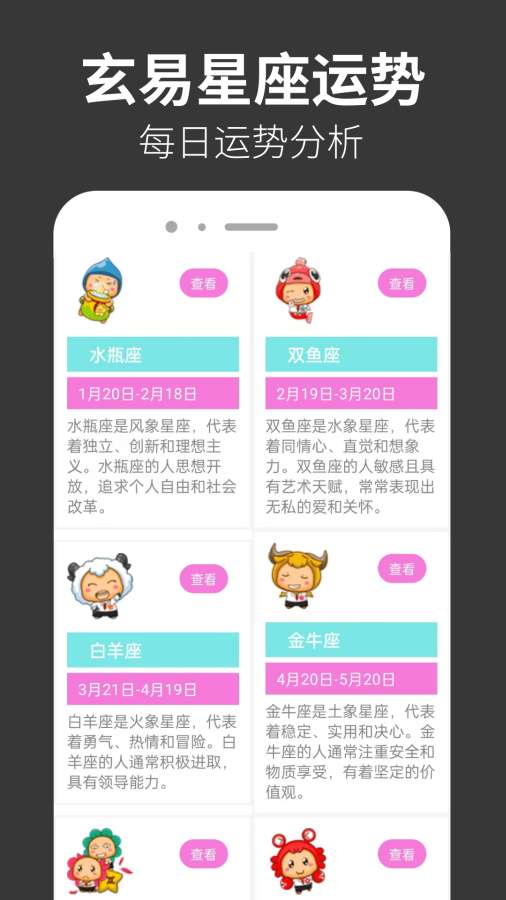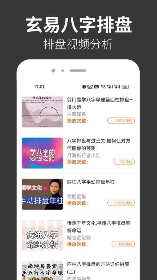 玄易八字排盘是一款集玄易八字排盘,玄易星座运势,玄易趣味测测,玄易炫酷时钟于一体的趣味休闲娱乐应用。各类八字排盘视频分析可以让你更多了解八字命理、四柱八字、五行八字等方面的知识。星座运势分析帮你快速查看不同星座人群的特点,包含爱情,财富,事业,健康等。趣味的爱情性格测试让你在休闲放松的时刻还可以了解到丰富的爱情、性格、社交等方面的知识。炫酷网红时钟彰显你独特的个性,等你来体验哟!! 来自应用汇: 玄易八字排盘