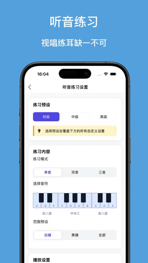 考虑到很多刚接触五线谱的用户遇到这么多钢琴键而不知所措的情况,我们针对性的将基础练习分为初级、中级、高级。在初级中我们将每个组别单独拎出来做练习,这样能让用户更好的练习和巩固。
