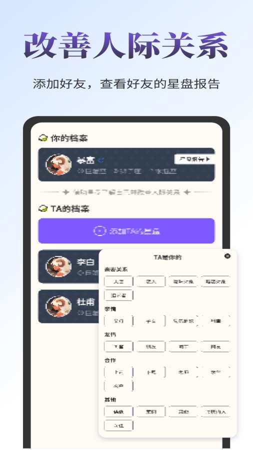【双人合盘】包含比较盘、组合盘、时空盘、马克思盘等两人合盘;