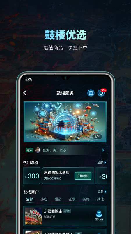 鼓楼服务:鼓楼服务是为用户提供的鼓楼街区内的本地生活服务,用户可以查看到已入驻平台的商户基础信息和售卖的商品、优惠券信息、热门商家广告、寻人寻物信息。用户可以鼓楼服务进行消费,购买商家的服务和商品,可以领取优惠券等。